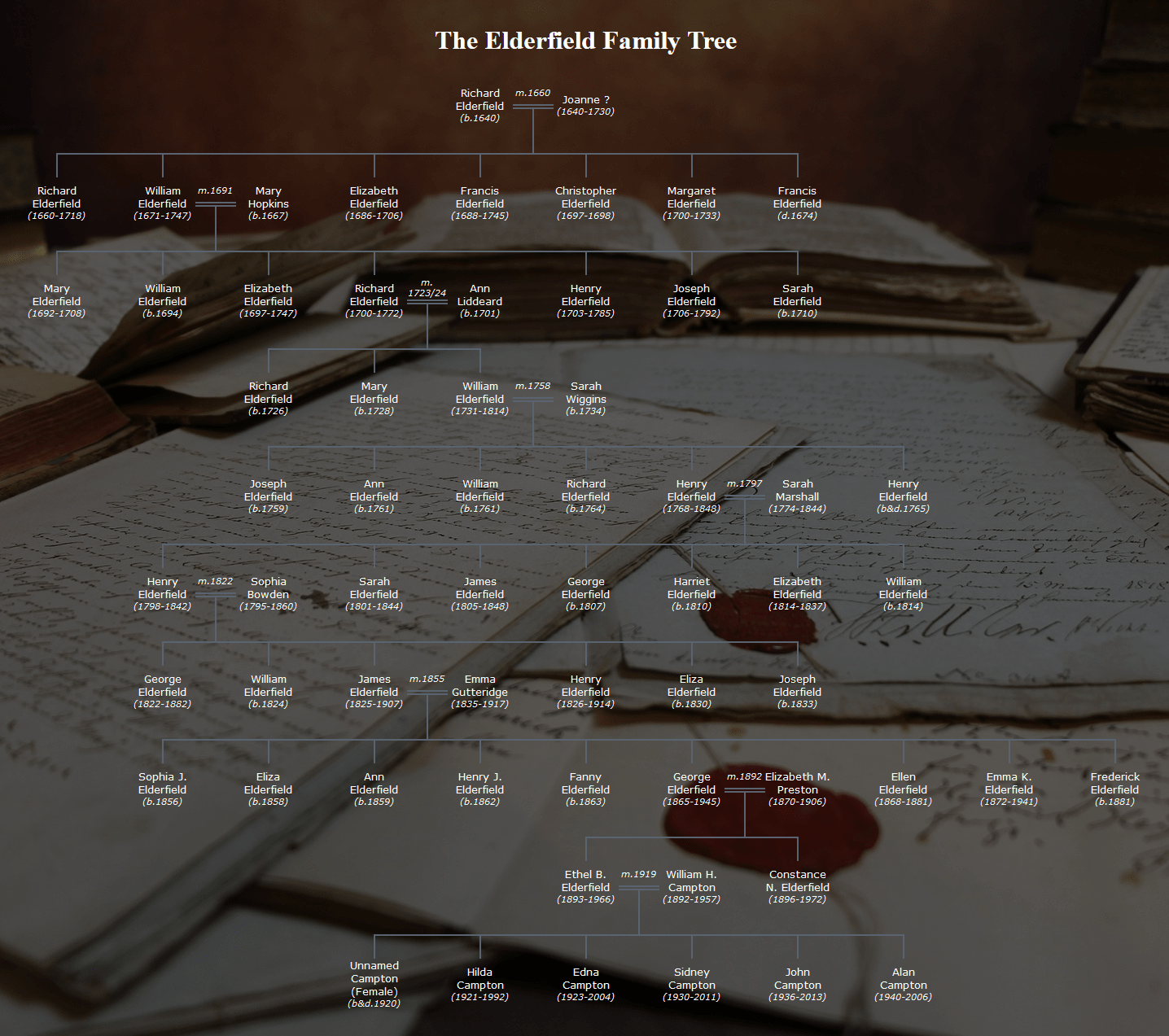 The Elderfield family that appears on this site dates back over 380 years and includes ten generations. Most of the members lived in Berkshire and Oxfordshire and the early generations appear to have been wealth Yeoman Farmers in East Garston, Berkshire.